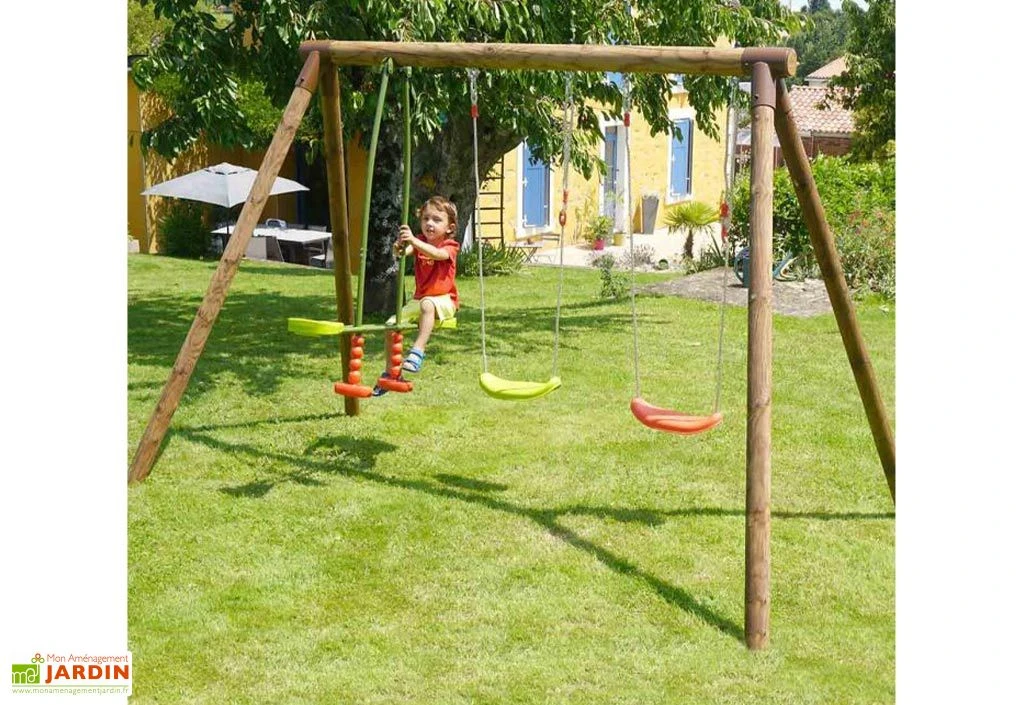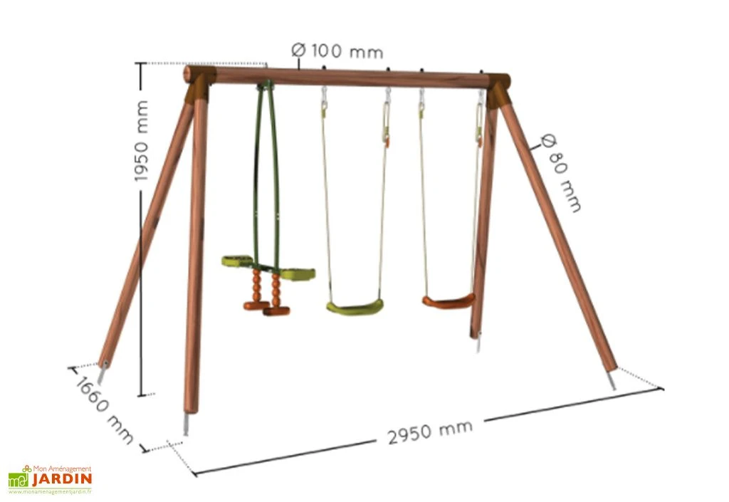 Le portique Pacco de la marque Soulet mesure 2,95 x 1,66 x 1,95 m et peut accueillir 4 enfants âgés de 3 à 12 ans. Il est équipé de deux balançoires pouvant supporter 50 kg chacune et d’un vis-à-vis pouvant supporter 70 kg (35 kg par assise). L’ensemble du jeu est conforme à la norme de sécurité EN 71.