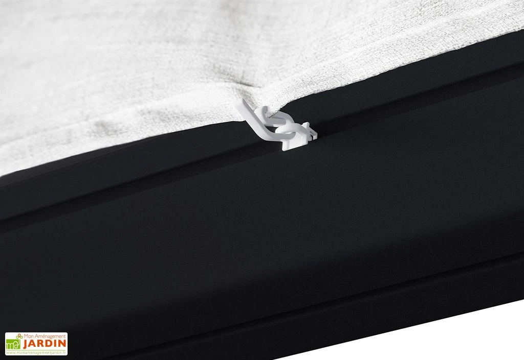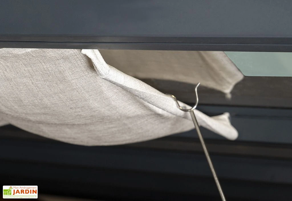 L’installation est facile : il suffit d’installer les crochets du rideau dans les œillets des rails directement intégrés sous la toiture de la pergola. Une tringle de 108 cm vous permet ensuite de faire coulisser aisément les rideaux pour moduler la luminosité et la chaleur sous la pergola.