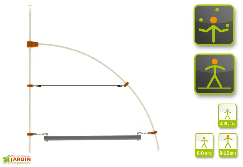 Le rondin d’équilibre de chez EVO est destiné à des enfants à partir de 4 ans. L’objectif est de développer l’adresse et l’agilité de l’enfant en le faisant passer d’un bout à l’autre du rondin. Il s’aide de la corde pour ne pas tomber tout au long du parcours. L’agrès se change en seulement 2 minutes grâce à un système intelligent breveté. De fabrication française l’agrès est résistant et permet de remplacer l’agrès de n’importe quelle aire de jeux EVO. Ainsi l’enfant découvre toujours de nouvelles attractions. Les agrès se changeant rapidement et facilement, il est aisé de passer de l’un à l’autre pour suivre les désirs et l’évolution de l’enfant. La garantie est de 2 ans.