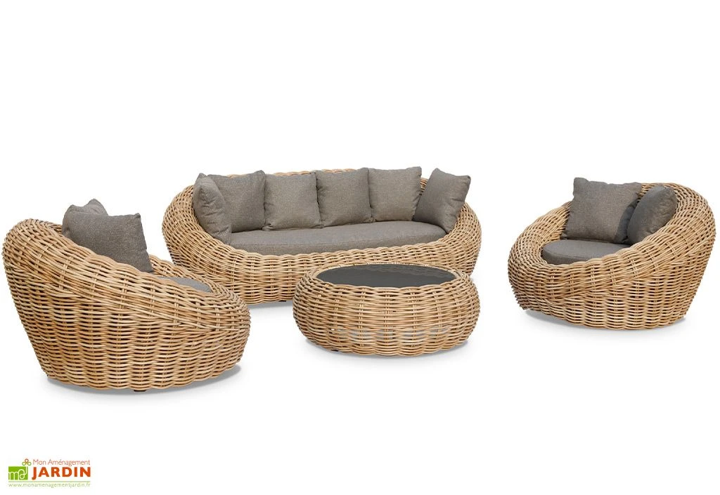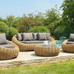La table basse, les fauteuils et le canapé sont habillés de résine tressée dont l’apparence ressemble à s’y méprendre à du rotin. La résine tressée est parfaitement adaptée à une utilisation en extérieur. Elle ne craint ni les intempéries, ni les rayons UV, et ne nécessite aucun entretien particulier.