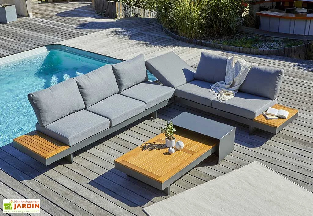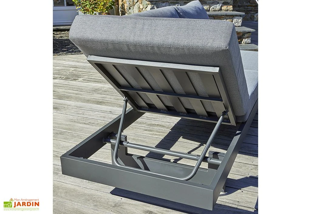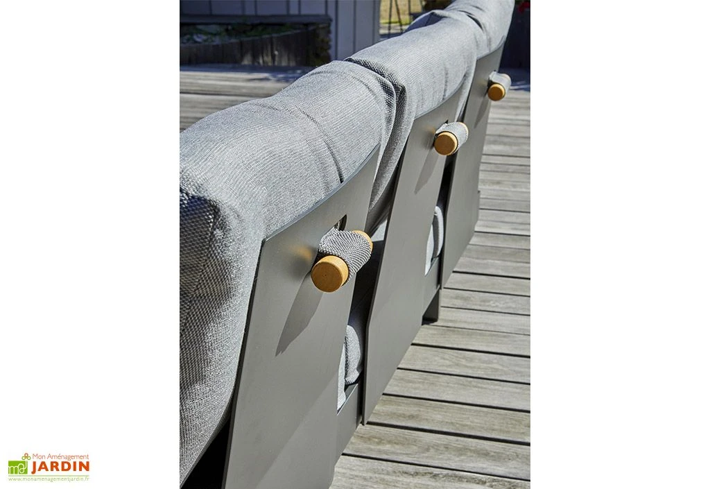 Le salon de jardin d’angle Vanuatu de chez DCB Garden est composé de deux méridiennes de trois places et d’une table basse de jardin que vous pourrez agencer à votre guise, selon vos besoins ou pour l’adapter au mieux à la configuration de votre extérieur. Il s’agit donc d’un salon de jardin modulable qui, outre son côté pratique, permettra également d’apporter une touche de modernité dans votre jardin ou sur votre terrasse.