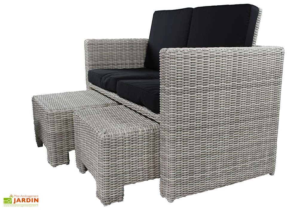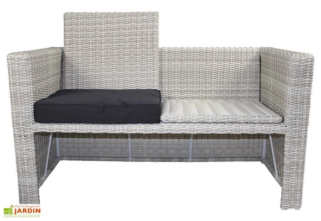 Les 2 canapés 2 places du salon de jardin mesurent 68 cm de profondeur, 128 cm de largeur et 70 cm de hauteur. La résine tressée possède une épaisseur de 5 mm. Ce sont des canapés deux personnes, qui sont livrés avec leurs coussins. Les coussins d’assises possèdent une épaisseur de 15 cm et une housse gris anthracite.
