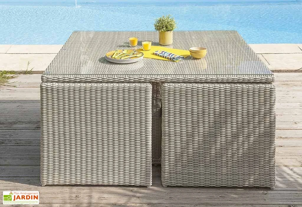 Le salon de jardin dispose également de 4 poufs en aluminium, résine tressée grise avec des coussins gris anthracite. La résine tressée résiste parfaitement aux UV et ne se décolore pas. Le salon de jardin est encastrable. Les poufs s’insèrent sous les canapés qui s’encastrent sous la table pour prendre peu de place.