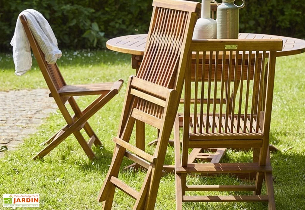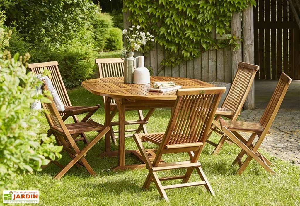 Le salon de jardin de Wilsa est entièrement fabriqué en teck huilé. Le teck huilé est un bois naturellement imputrescible qui assure la longévité et la résistance aux intempéries de votre mobilier.