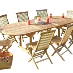 L’ensemble de mobilier de jardin se compose de 8 chaises et d’une table ovale et pèsent 96 kg. La table est modulable grâce à sa rallonge facile d’utilisation et peut accueillir 10 personnes maximum.