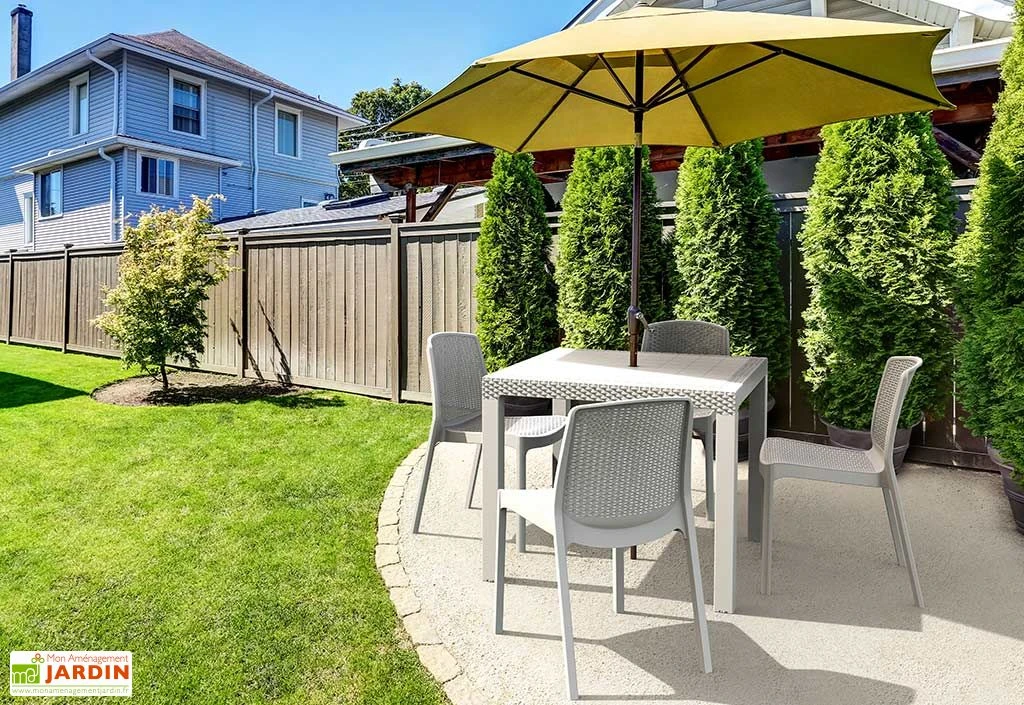 Cet ensemble de repas extérieur est particulièrement complet, les chaises et fauteuils de jardin étant empilables il vous sera possible de les ranger très facilement. De plus, la table de jardin est munie d’un espace pour insérer un parasol afin de vous protéger du soleil. Enfin, son montage est très simple et accessible à tous. Ce mobilier de jardin étant conçu intégralement dans un matériau résistant aux intempéries, il ne vous demandera aucun entretien particulier.
