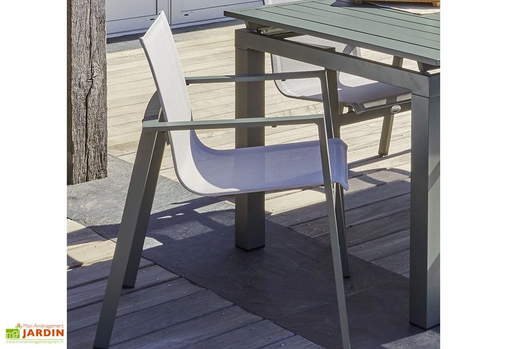 Les chaises de jardin sont elles aussi dotées d’une armature en aluminium, ce qui leur permet d’être à la fois solides et faciles à déplacer car plutôt légères. L’assise et le dossier de chaque siège sont fabriqués en textilène, une toile de PVC tissée robuste et facile à nettoyer. Le textilène est même traité anti-UV, ce qui évite tout risque de jaunissement ou de décoloration au fil du temps.