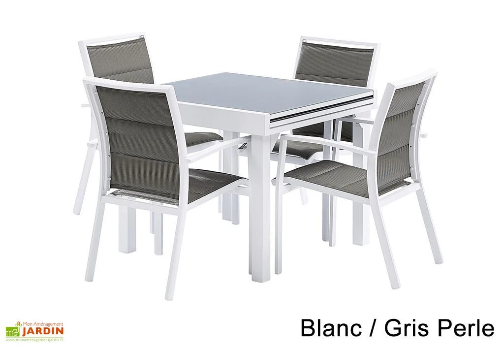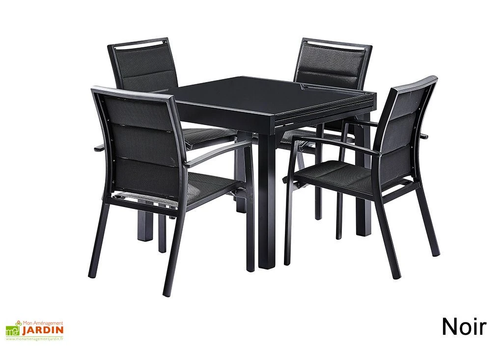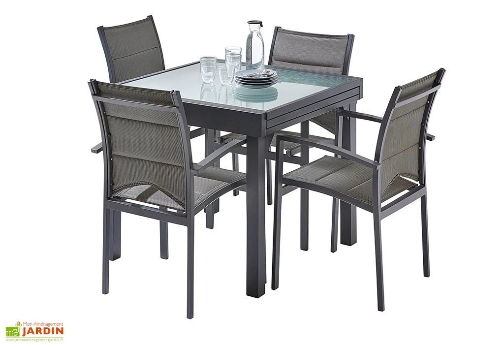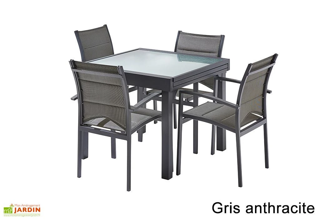 La table à manger est livrée avec 4 fauteuils assortis en aluminium et textilène. Les fauteuils mesurent 57 x 61 x 87 cm (l,l,h). Vous pourrez compléter votre salon avec d’autres chaises ou fauteuils assortis que vous trouverez dans votre rubrique accessoires.