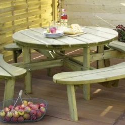 La table de pique-nique de Solid est ronde et équipée de 4 bancs. D’excellente qualité, cette table de jardin dispose d’un plateau d’une épaisseur de 40 mm et de 1,34 m de diamètre. Toute la table est en pin traité autoclave de classe 3, résistant parfaitement à la moisissure et aux insectes.