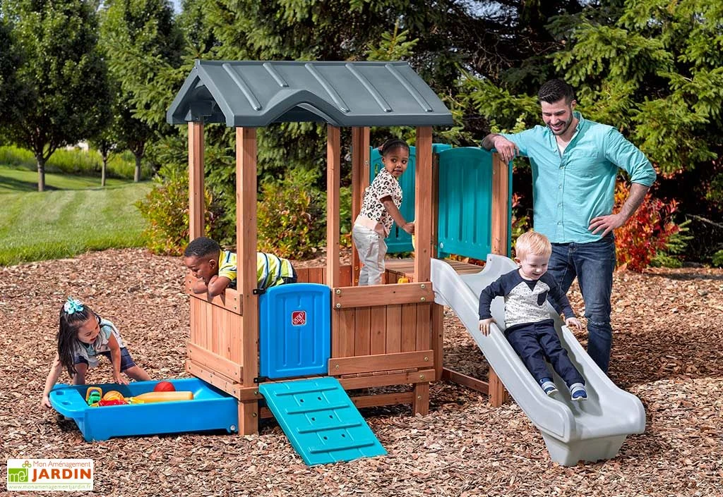 La cabane pour enfant de chez Step 2 est une petite aire de jeux destinée aux enfants à partir de 3 ans et jusqu’à 8 ans. Elle mesure 213, cm de longueur, 165,6 cm de largeur et 184,5 cm de hauteur et comprend les éléments suivants :
