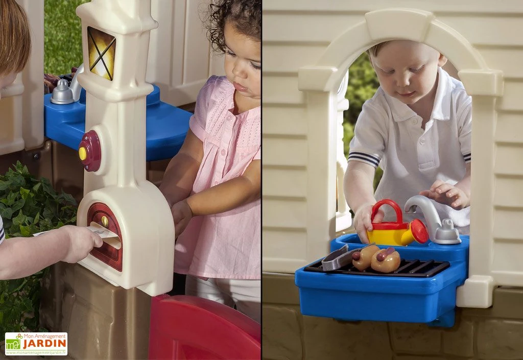 La maison de jeu comprend beaucoup d’équipements pour que les enfants puissent s’amuser à plusieurs pendant des heures : porte d’entrée hollandaise, fenêtres dont l’une avec volets, sonnette réaliste, boîte aux lettres, téléphone factice, bac à fleurs et cuisine avec siège, évier, robinet et tablette.