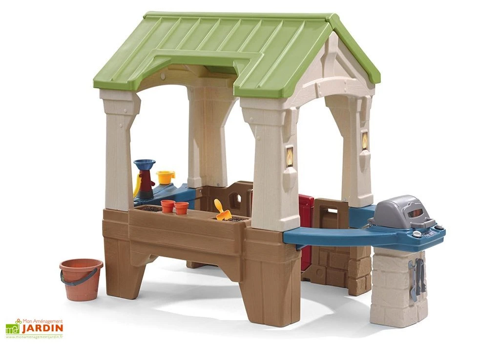 Cette maisonnette de chez Step2 de taille 140 x 95 x 137 cm (l,l,h) propose un intérieur spacieux avec de grandes fenêtres ouvertes sur l’extérieur. Il y a également une demi porte style hollandaise pour entrer dans la cabane et une boîte aux lettres pour s’échanger des dessins ou petits mots.