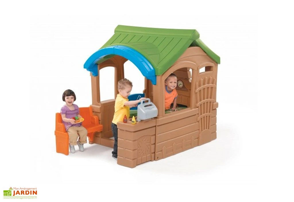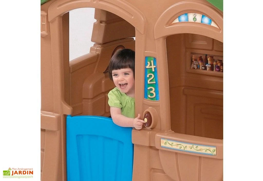 La cabane est équipée d’un banc où deux enfants pourront s’asseoir et d’un grill (factice) intégré à la terrasse extérieure. La maison est également équipée d’une cuisine avec évier et d’une sonnette électronique (piles non fournies). La cabane dispose d’une porte qui peut s’ouvrir et se fermer et de grandes fenêtres.