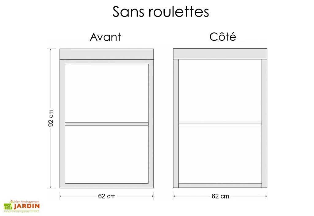Ce chariot mesure 62 cm de côté et comprend 3 étagères. Il est livré avec 4 roulettes pour vous permettre de le déplacer facilement. Vous pouvez également choisir d’installer les pieds réglables en hauteur, inclus. La hauteur du chariot passe de 92 cm avec les pieds à 98 cm avec les roulettes.