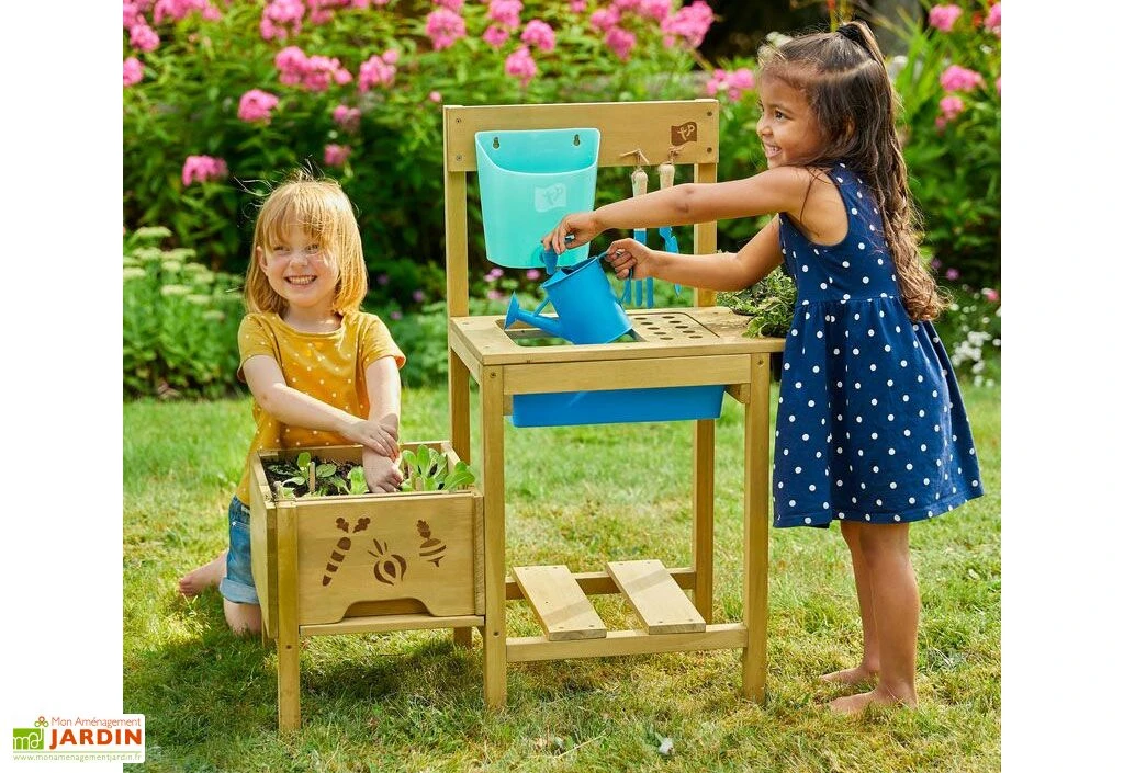 Cette petite table de rempotage comprend un bac qui pourra recevoir la terre et les graines, un réservoir d’eau et une bassine pour se laver les mains après avoir jardiné et des étagères pour ranger facilement leurs petits outils. Des pots sont également inclus.