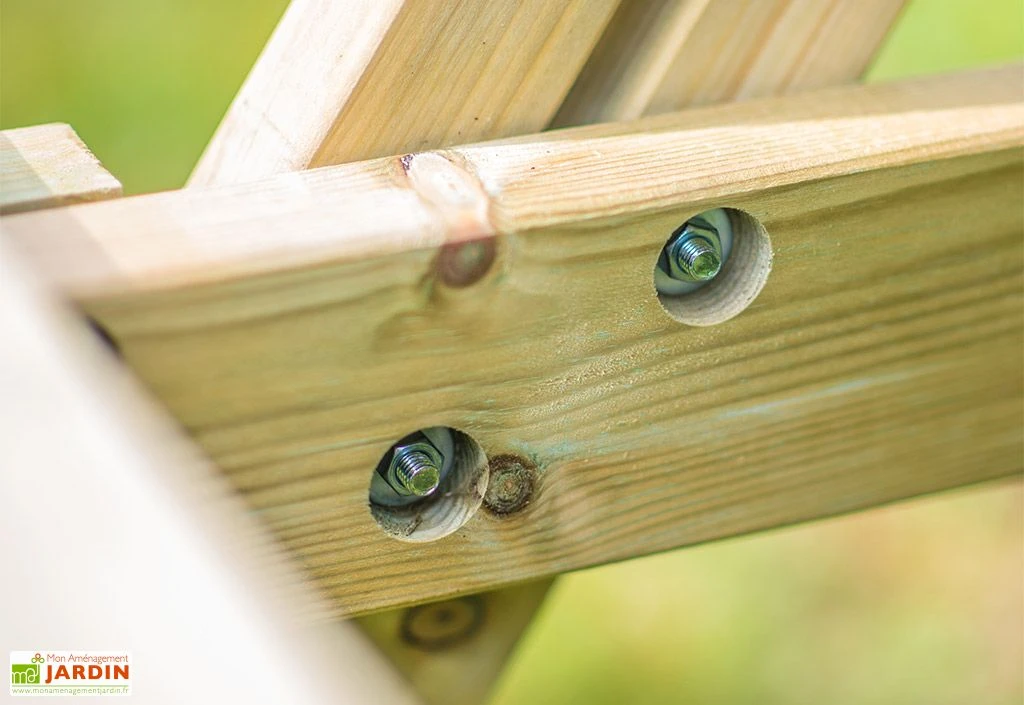 Cette table de pique-nique en bois Ekju a bénéficié d’un traitement autoclave classe III teinté brun, ce qui lui assure une excellente résistance face aux agressions extérieures : moisissure et attaques d’insectes. La coloration brune du traitement permet d’éviter la teinte verte généralement observée suite à un traitement autoclave. Il vous suffira ensuite d’appliquer une huile ou un saturateur chaque année pour conserver cette teinte et protéger le bois du grisaillement.