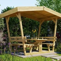 Cette petite tonnelle signée Weka est idéale pour profiter d’un espace couvert où partager un repas en famille ou entre amis. Elle comprend en effet une table de 63 x 180 cm ainsi que deux bancs 53 x 180 cm, le tout protégé par une toiture à deux pans en bois massif qui vous abritera de la pluie ou des rayons du soleil, selon la météo. Un revêtement bitumé est fourni pour recouvrir cette toiture, mais il est conseillé d’optimiser son étanchéité sur le long terme en posant une couverture type shingle (surface de toit à couvrir : 6,1 m²).