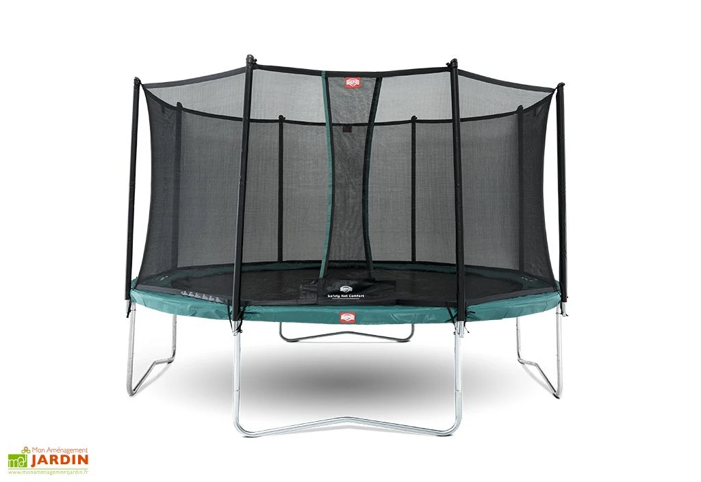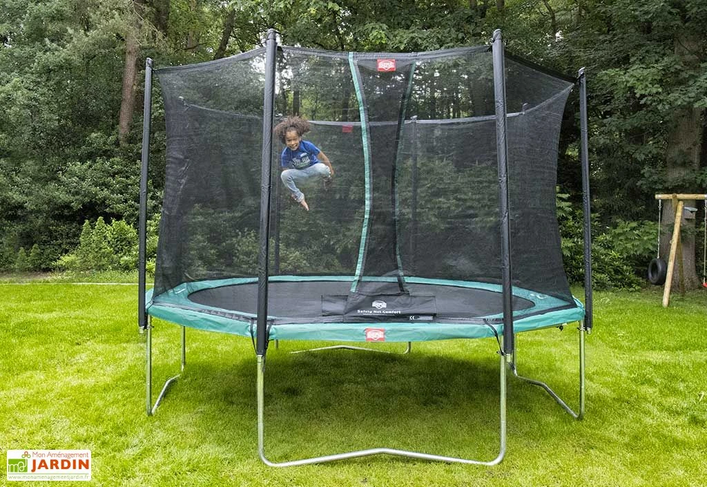Ce trampoline sur pieds est également équipé d’un filet de sécurité dont l’entrée est facilement accessible. Notez qu’afin d’éviter tout risque d’accident, il est conseillé de prévoir un périmètre d’au moins 2 m tout autour du trampoline. Le Favorit 380 étant livré en kit, il vous faudra procéder à son montage vous-même.