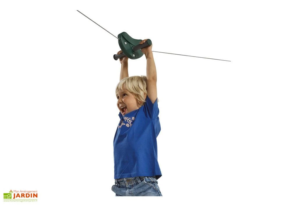 Votre tyrolienne Para de chez KBT permet d’amuser vos enfants en toute sécurité. La tyrolienne est équipée de poignées douce anti-glissement, d’un câble d’un longueur de 30 mètres et d’un diamètre de 4 mm. Le poids maximum supporté est de 80 kg. Votre tyrolienne est disponible en 2 coloris au chois : rouge ou vert. Cette tyrolienne bénéficie de la norme EN 71 1238.